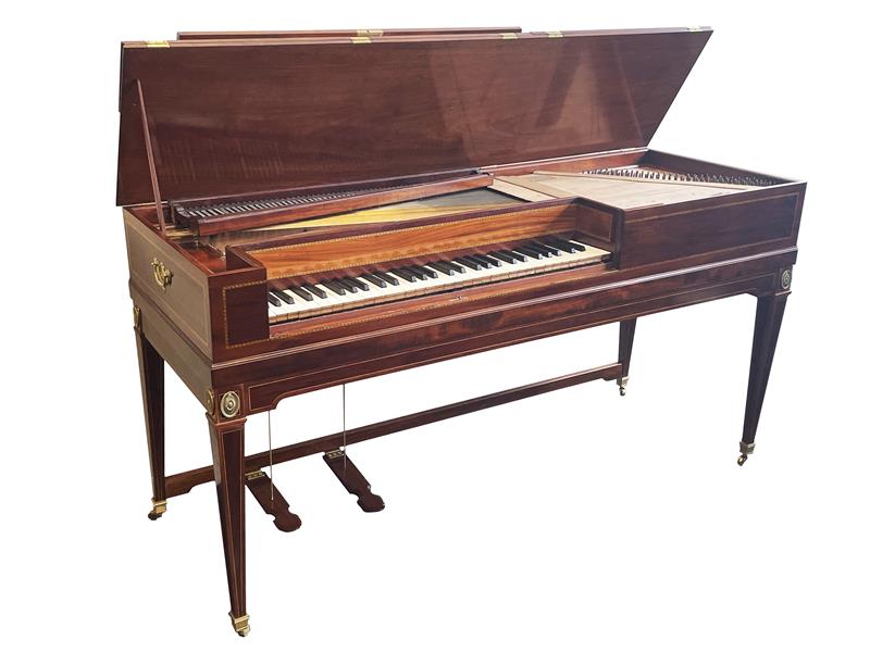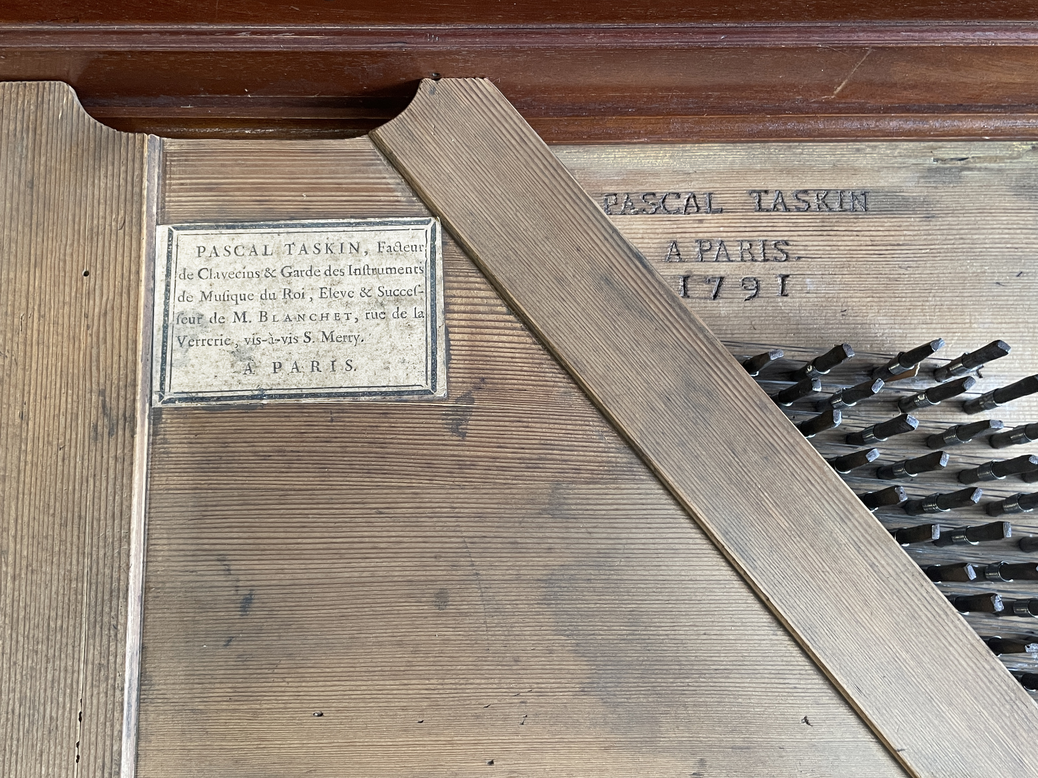 Pascal Taskin (1723-1793) was born in Thieux, in the province of Liège in Belgium. At the start of his career, he emigrated to Paris to apprentice with Etienne Blanchet, the best French harpsichord maker of the time. From around 1770, he began importing English square pianos and from 1776, in addition to his famous harpsichords, he made his own fortepianos. Six of his pianos have survived: four grand models (Yale Collection New Haven 1780, Musikinstrumenten-Museum Berlin 1787, Philharmonie de Paris Musée de la Musique 1788 and Chateau de Versailles Paris 1790) and two square pianos (Philharmonie de Paris Musée de la Musique 1787 and the Chris Maene Collection 1791). A special feature of the square piano from the Chris Maene collection is the mechanism of the keyboard. In this instrument, the keys are guided at the rear, as in harpsichords, in contrast to conventional square pianos, where the keys are guided at the front. Also as with a harpsichord, the depth of the key is determined by setting the rise height at the rear using a stop instead of limiting the depth with felt at the front under the key. Former owners: Collection Knud Kaufmann Brussels