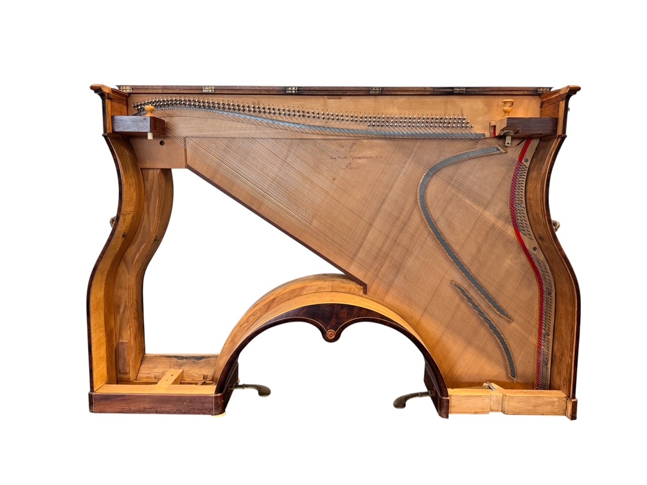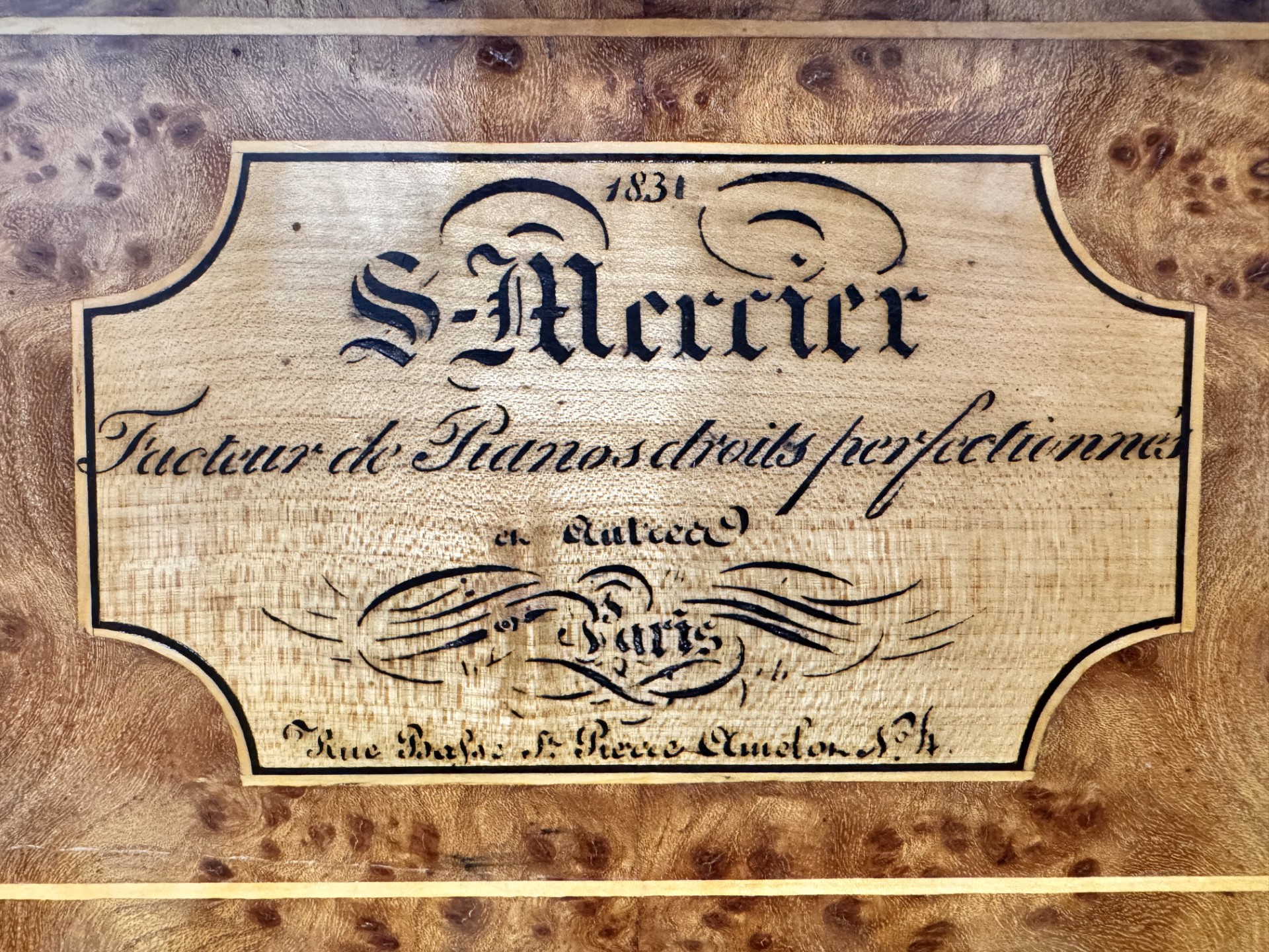 In 1830, Sébastien Mercier began working as an independent piano maker. Before that, he became familiar with the rise of the upright piano in France while working in the workshop of Roller & Blanchet, who were pioneers in making more compact pianos for the bourgeoisie. By arranging the strings diagonally from the upper left to the lower right, they were able to use longer strings within a case of limited height. This principle created a semicircular recess at the bottom, which gave these instruments names such as “piano-pont,” “niche de chien,” or “dog kennel.” Mercier’s instruments were highly refined, both in terms of their mechanism and their finish. They were therefore intended for the salons of the wealthier bourgeoisie.